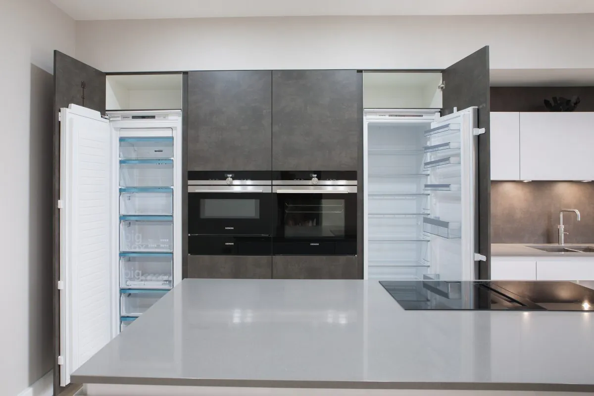 The symmetry of this design creates a striking effect that’s exceptionally pleasing on the eye. The state-of-the-art Siemens ovens either side of the sink area bring a beautiful balance that’s emphasised by the recessed overhead cabinetry in dark cement finish. This design feature is highlighted by stylish under-cabinet lighting which gives the cupboards the appearance of hovering above the space.