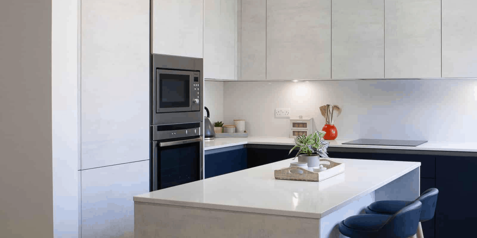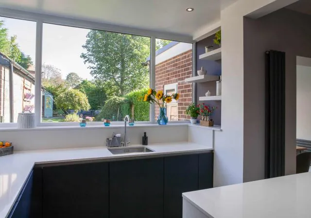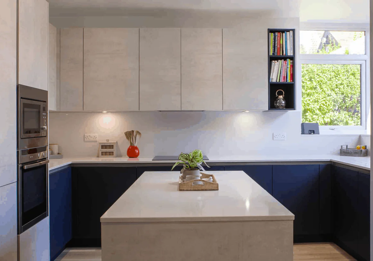 Another element of the brief was to create a sense of cohesion between the kitchen and living areas without allowing the large kitchen to dominate. We achieved this by extending the kitchen island into a dining area, introducing the same oak finish as the tower units for a sense of fluidity whilst giving a comforting nod to a traditional dining table. Beautiful and quirky globe pendant lights positioned over the seating area emphasise the contrasting zones of the working and living space, with downlights providing a very minimal and practical lighting option.