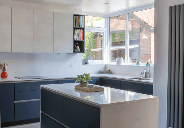 The L-shaped island allows for a free flow of movement through the space as well as providing a work surface within reach of every storage unit. We created further space for preparation & mixing within the old chimney breast and included an additional work surface that is discreetly built within a pocket door system where tea and coffee could be made without interrupting the sleek design. Positioning the hob so that it faces the seating area gives the host a feeling of being at the head of the table while cooking, making guests feel comfortable to sit and relax. State of the art Miele appliance give this stunning yet practical kitchen remarkable functionality, exactly what our client was looking for.