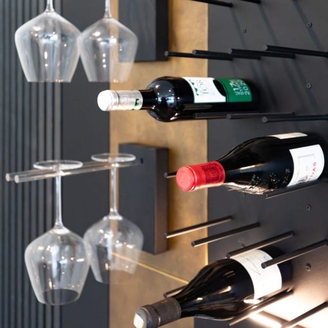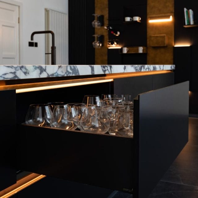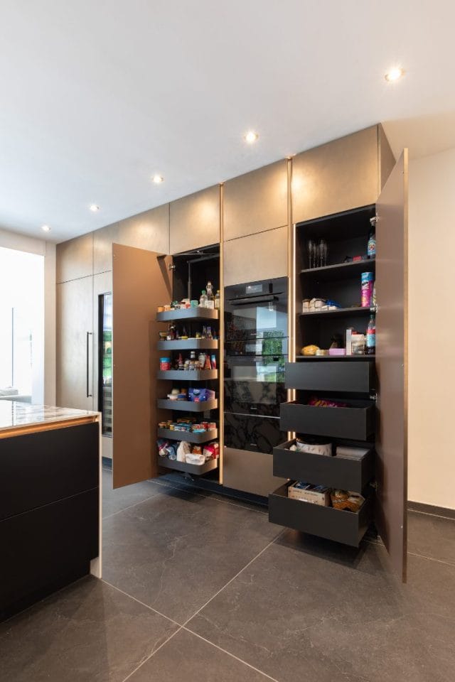 The kitchen is illuminated with thoughtfully placed lighting fixtures that enhance functionality and ambience. The pendant lights above the island create a warm, inviting atmosphere, perfect for intimate dinners or lively gatherings. Recessed lighting throughout the space ensures optimal visibility, making meal preparation a breeze. Kreativ Kitchen’s designers maximised the kitchen’s efficiency with innovative storage solutions. The full-height cabinets, finished in a rich bronze hue, provide ample space for all the family’s culinary essentials. Soft-closing mechanisms and concealed handles enhance the sleek, modern look while ensuring easy access to all kitchenware. A beautifully designed shelving unit adds functionality and aesthetic appeal with open and closed storage for the family to showcase their favourite items while keeping everyday essentials within easy reach. The shelving unit’s warm bronze and black finish complements the overall colour scheme, enhancing the kitchen’s sophisticated vibe.