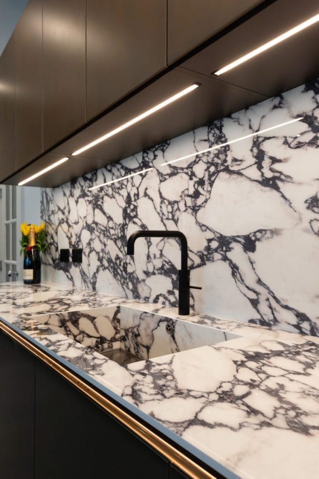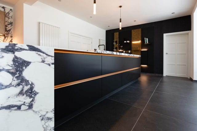"The 6m island split over two levels with vein matched mitred leg and back panel are the true stand out of this beautiful kitchen along with the stunning ambient lighting that i-luminate offers."