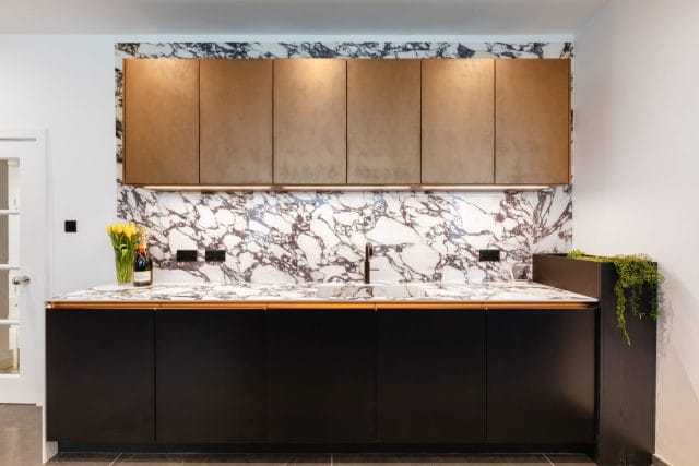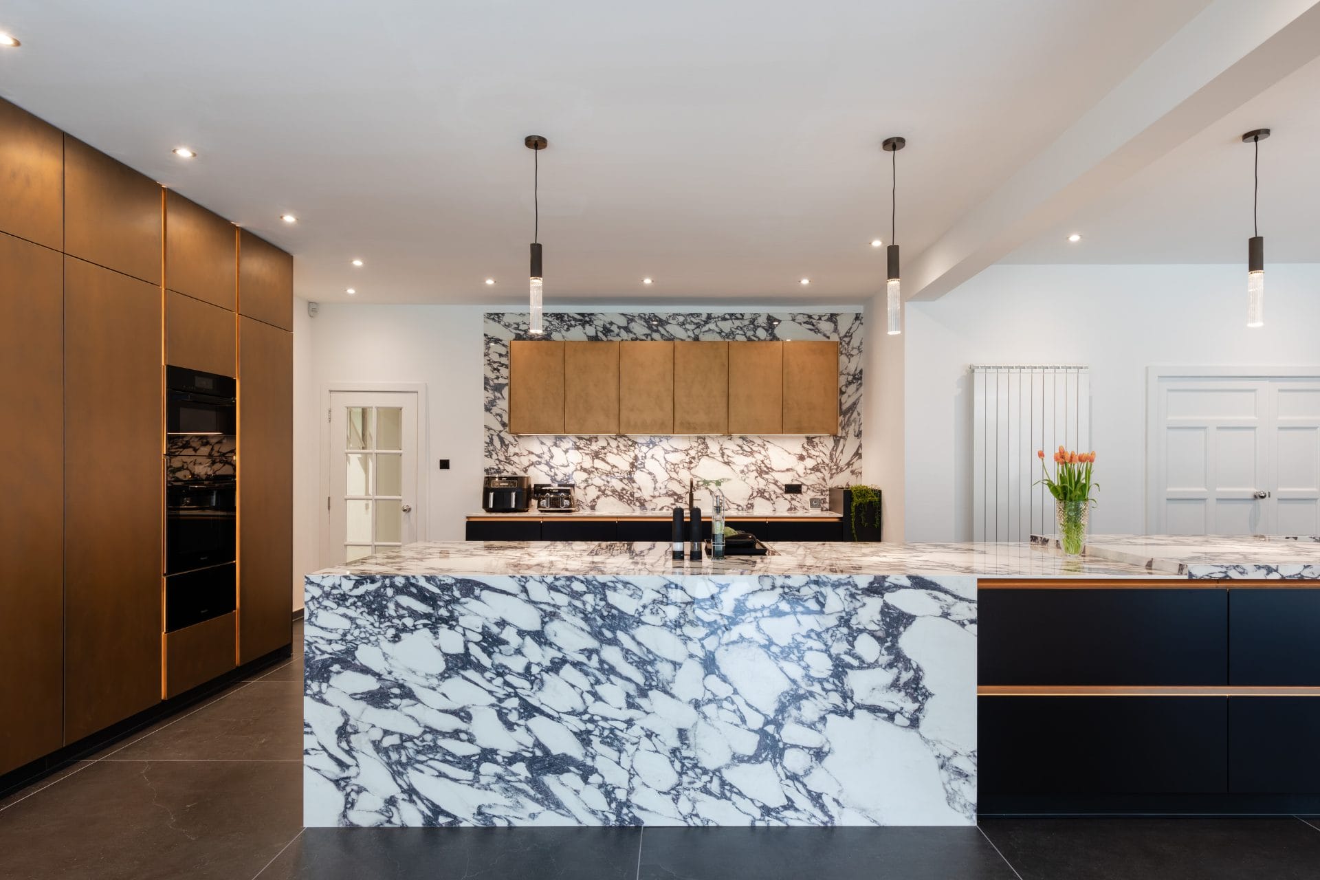 This breathtaking metallic bronze and graphite aluminium kitchen is a stunning blend of elegance and functionality that features a harmonious combination of luxurious materials, modern appliances, and careful craftsmanship, ensuring an unparalleled culinary experience for our clients in Alwoodley. The Viola Xtone porcelain worktops boast an intricate veining pattern, adding a touch of opulence and timeless beauty. The island serves as a focal point, seamlessly blending with the overall design while providing ample space for meal preparation and social gatherings. Equipped with top-of-the-line Miele appliances and a Bora hob, this kitchen guarantees exceptional performance and reliability. The sleek, integrated design of the appliances complements the contemporary aesthetic, ensuring a cohesive look throughout.