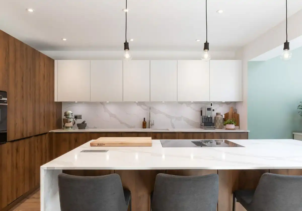 Featuring breathtaking Antique Oak cabinetry and beautiful, veined Calacatta quartz surfaces, this Harrogate kitchen makes a showstopping backdrop to our client’s stylish new living space. This opulent pairing undeniably imbues the design with a sense of grandeur and sophistication. The dramatic oak finish adds real richness and warmth. Meanwhile, the clean Arctic White wall units help offset the standout surfaces, bringing a fresh and airy edge to the interior. They complement the quartz worktops and pastel living room scheme perfectly. Chic black handles and accessories make the perfect contemporary finishing touch, completing the on-trend aesthetic.