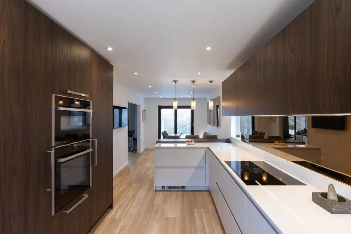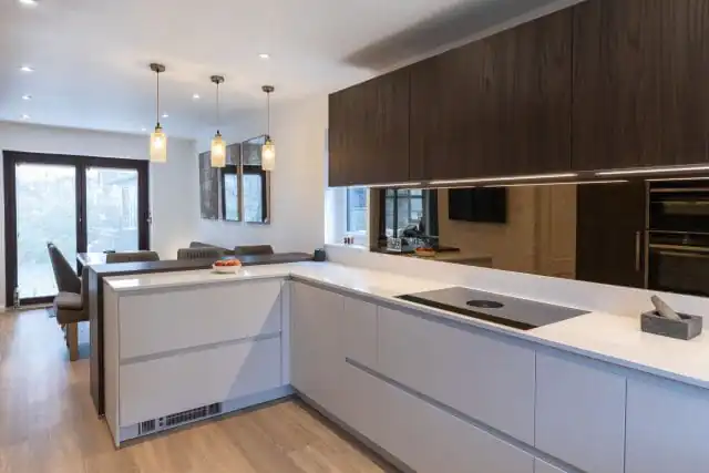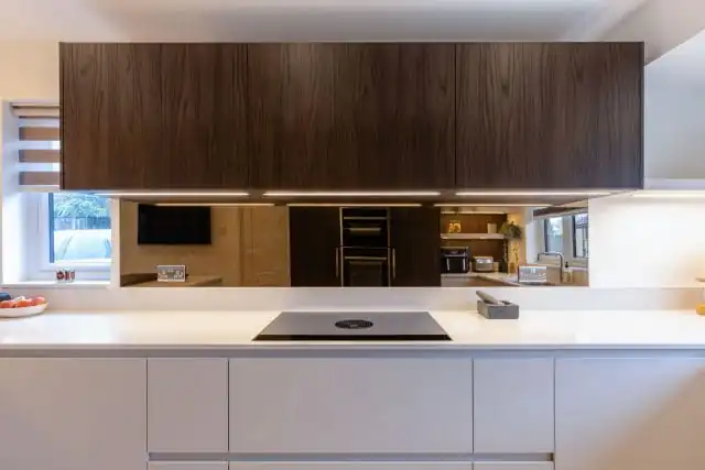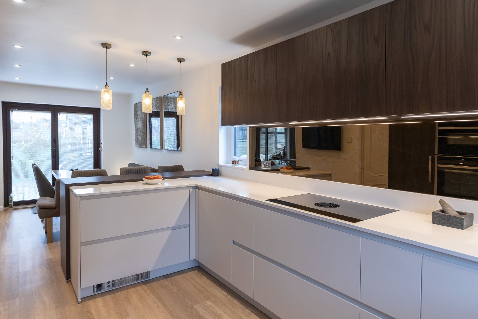 Lastly, the attention to detail in this kitchen’s design extends to the choice of materials and textures. A sumptuous, mirrored splashback adds a tactile element against the glossy and durable quartz worktops, ideal for a busy kitchen environment. This versatile kitchen design is ideal for social cooking and entertaining, offering a distinctive two-tone finish that seamlessly blends warmth and practicality. Its inviting ambience is matched by a well-considered layout, ensuring comfort and functionality in a space where practicality meets aesthetic appeal.