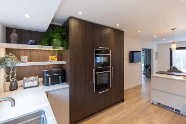 This G-shaped kitchen’s minimalist design boasts sleek lines and an almost monochromatic colour palette. The layout allows a seamless flow around the living space, creating an expansive feel that’s both inviting and functional. The cabinetry extends to a two-tone, layered breakfast bar serving as the kitchen’s centrepiece. The luxurious textures of the Pronorm cabinetry infuse the kitchen with a sense of drama and elegance, elevating the sleek design to new heights. The deep, wooden allure of the Dark Sherwood finish draws inspiration from nature, inviting it indoors and adding layers of depth and complexity to the space. Anchoring the design is an expansive Silestone Miami Vena Quartz worktop, which provides ample room for culinary exploration and features a state-of-the-art Bora extractor hob, marrying innovation with the art of cooking.