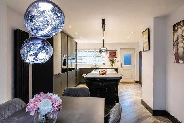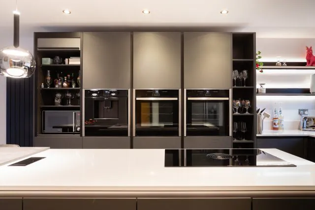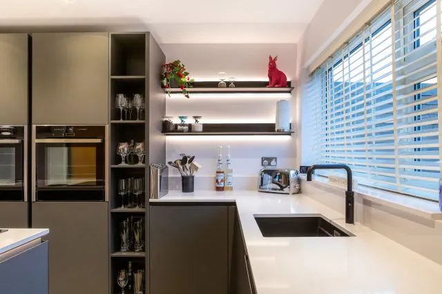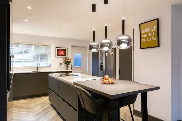 From the striking illuminated shelving to the gorgeous slate-effect breakfast bar, this stunning Bradford kitchen is brimming with elegant and eye-catching details. While the flawless Grey Pearl handleless cabinets establish a minimal and understated backdrop, fabulous pendant lights, trendy bar stools, and a slim shelving niche add a glamorous edge. This fabulous kitchen makes a lovely place to cook and spend time.