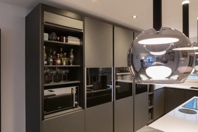 On the far side of the kitchen, we built two clever pocket-door pantry cupboards and a fantastic American-style fridge-freezer into the wall. Their clean, built-in design adds to the sophisticated aesthetic. This kitchen effortlessly fuses stylish looks and outstanding functionality. One of our favourite features is the luxurious drinks cabinet hidden neatly behind a sliding tambour door. The breakfast bar also makes a useful and attractive addition, offering the ideal spot to enjoy a morning coffee or a G&T before dinner.