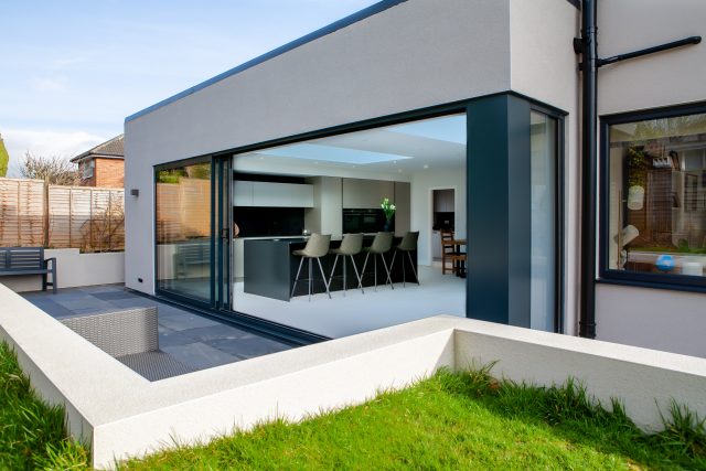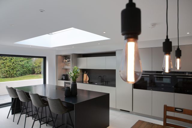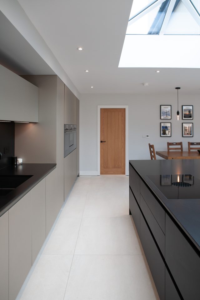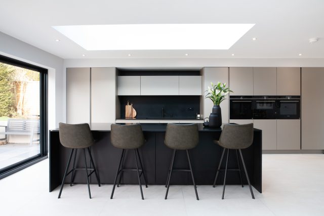 Pairing clean, minimalist cabinetry with a soft taupe grey and contrasting black colour scheme instantly imbues this space with chic drama and sophistication. Striking sleek lines and coherent modernist-inspired planes give this Leeds kitchen a crisp architectural finish. The overall effect is truly stunning.