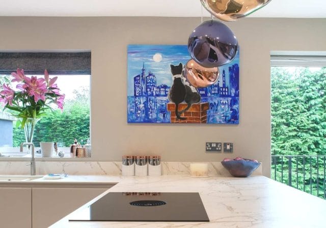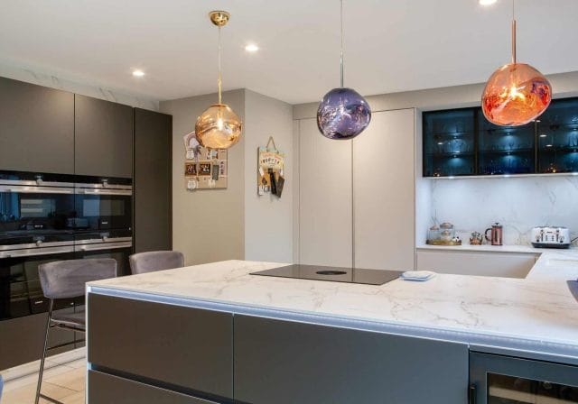 The fabulous contemporary details in this Bramhope kitchen are what truly set it apart. An opulent marble finish surrounds dark grey tower units mirroring the exquisite worktops for an exceptionally luxurious bespoke feature. Reflective accents bring life and vibrancy to the space. Deep blue organic glass is illuminated from behind to create extraordinary display shelving that’s both inventive and stylish. The playful yet sophisticated glass overhead cabinetry is emphasised by contemporary orb pendant lights positioned to highlight the statement island and dining area. The pendant lights are a wonderful opportunity to add colour to the design, capturing our client’s personality. This charming introduction of colour allows other vibrant details to enter the space such as our client’s favourite artworks and decorative ornaments. Task lighting below the cabinets and strip lighting integrated into the peninsula make the space glow even more for a luxurious contemporary feel.