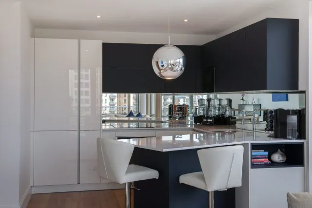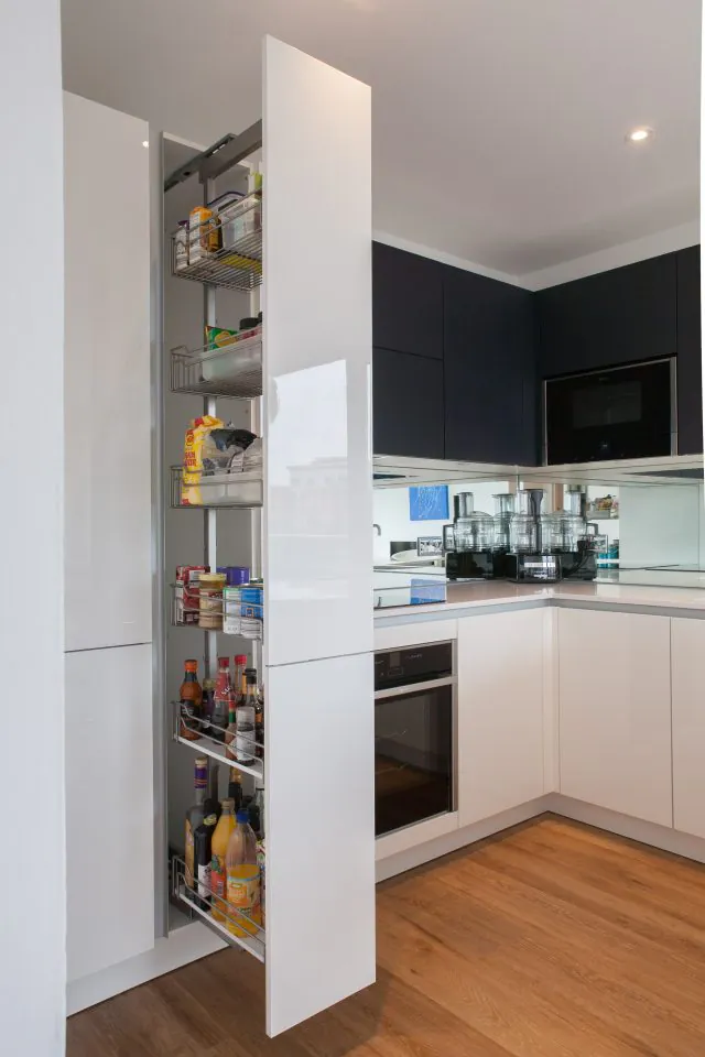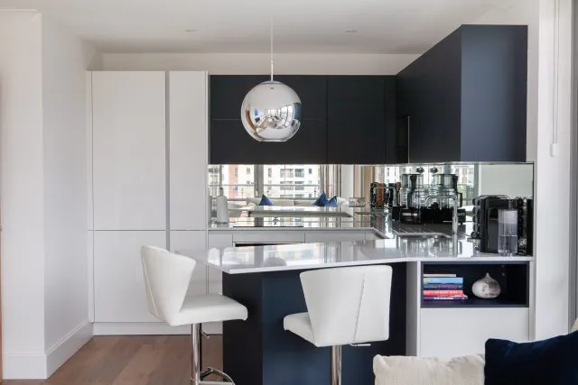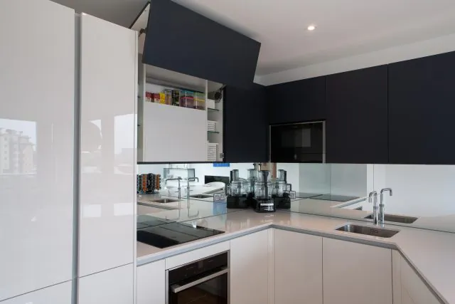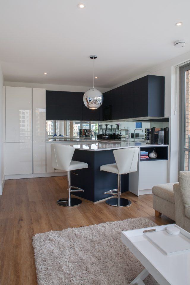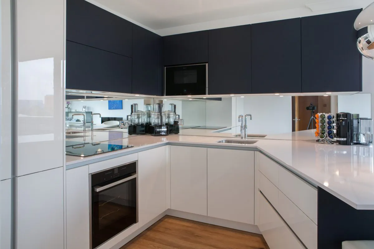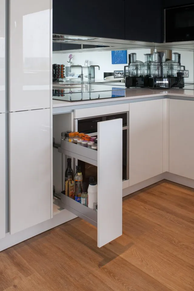 Dark flooring pairs beautifully with the similarly dark Sherwood cabinets, establishing a bold design statement. Skylights and bi-fold doors provide ample natural light which reflects off the stunning Blanco Zeus Quartz worktop and Brilliant Cubanit units, emphasising the wood grain detailing. The generous use of white in this kitchen creates a dramatic contrast whilst producing a bright and spacious atmosphere.