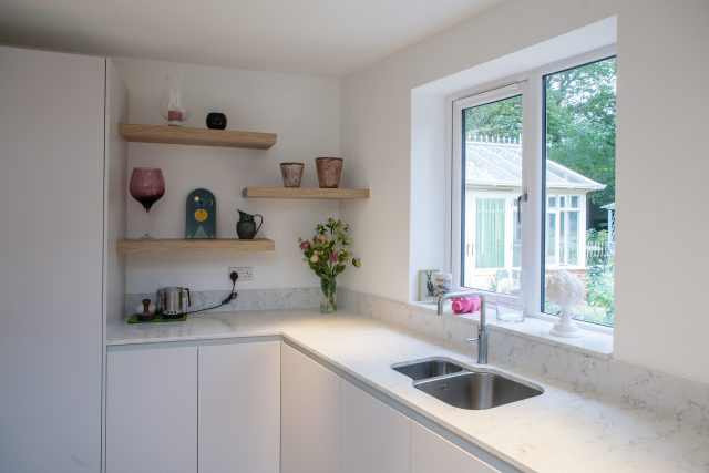 There’s absolutely no shortage of personality in this extraordinary project which we designed & installed for our client in Copmanthorpe, York. The midnight blue & light grey colour scheme combine with white Arabesque Quartz worktops and wood shelving & breakfast bar to create a warm and luxury feel in this unique open space.