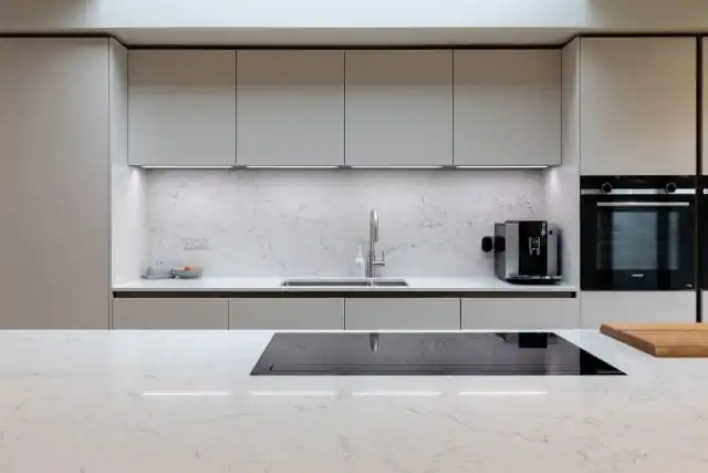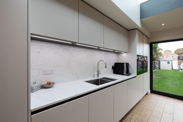PRONORM X-LINE ANGORA GREY & LAVA WITH CAESARSTONE WHITE ATTICA QUARTZ WORKTOPS