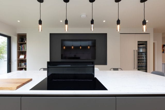 In the centre of the kitchen design, a multifunctional island takes centre stage, offering seating, storage and a flawless Novy downdraft hob. This dynamic appliance blends seamlessly into the surface, as the black finish of this appliance complements the black accents on the pendant industrial lighting above the island. These black tones and the characterful lighting add an urban edge to this modern design. The island is the epitome of convenience and provides a perfect setting for socialising and hosting.