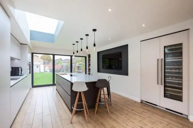 Facing the opposite wall of the cabinetry is a media centre, with a large screen integrated into a recessed niche within the wall. Set against a dark grey backdrop, this eye-catching appliance showcases how the kitchen plays many roles within your home, not only a place to create meals and host but also a space where you can relax. On either side of this are useful features, such as open shelving on the left, which provides space to display personal items and store kitchen essentials such as cookbooks. To the other side of the media centre is an impressive and elegant fridge freezer and wine chiller, accompanied by a beautiful window feature which allows you to view all your wine options without having to access the chiller itself.