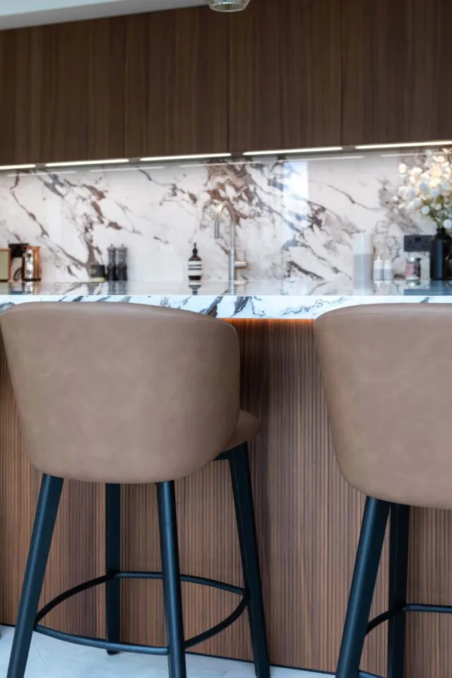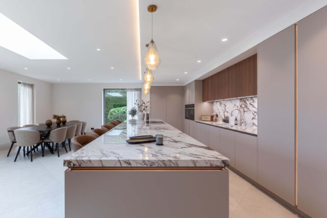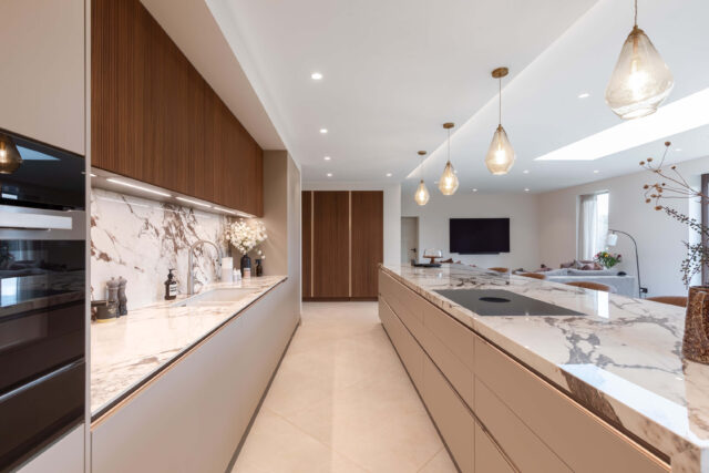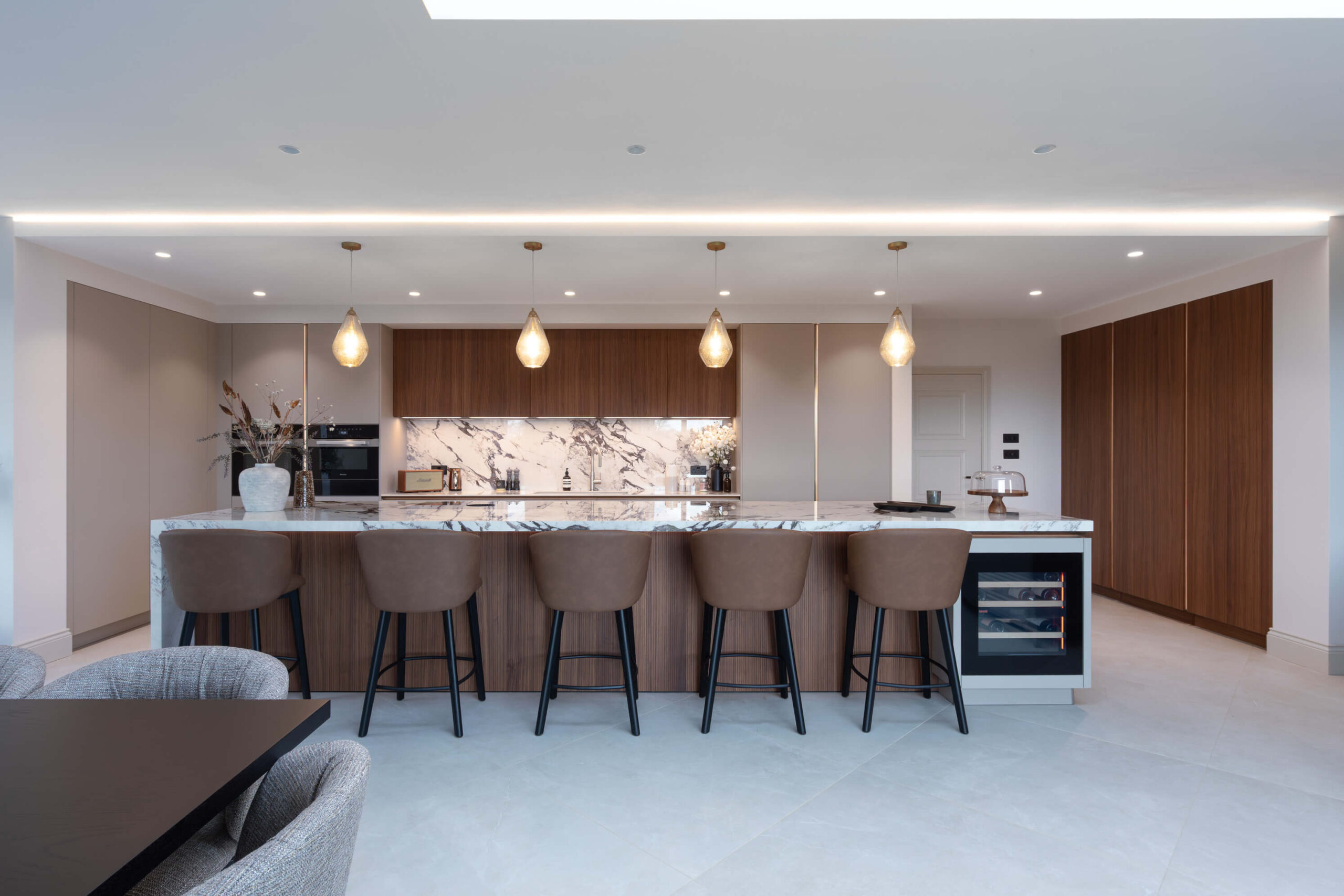 This contemporary kitchen transformation reimagines the rear of the home as an open-plan space designed for cooking, dining and relaxing. The combination of rich materials, clean architectural lines and thoughtful lighting creates a luxurious atmosphere with a warm, inviting feel.