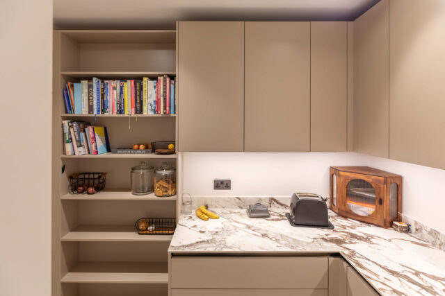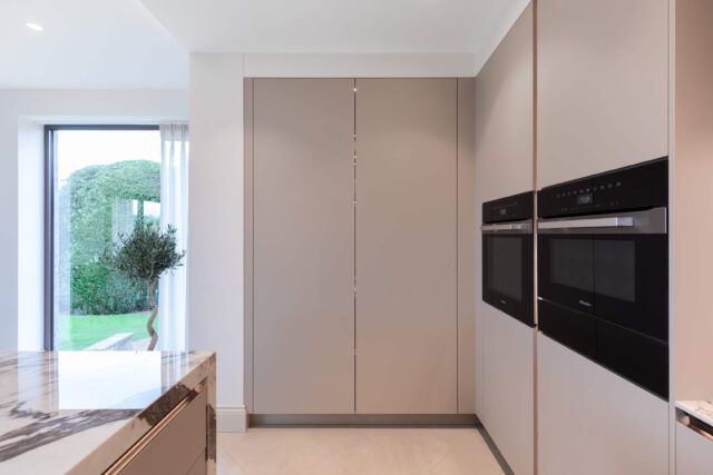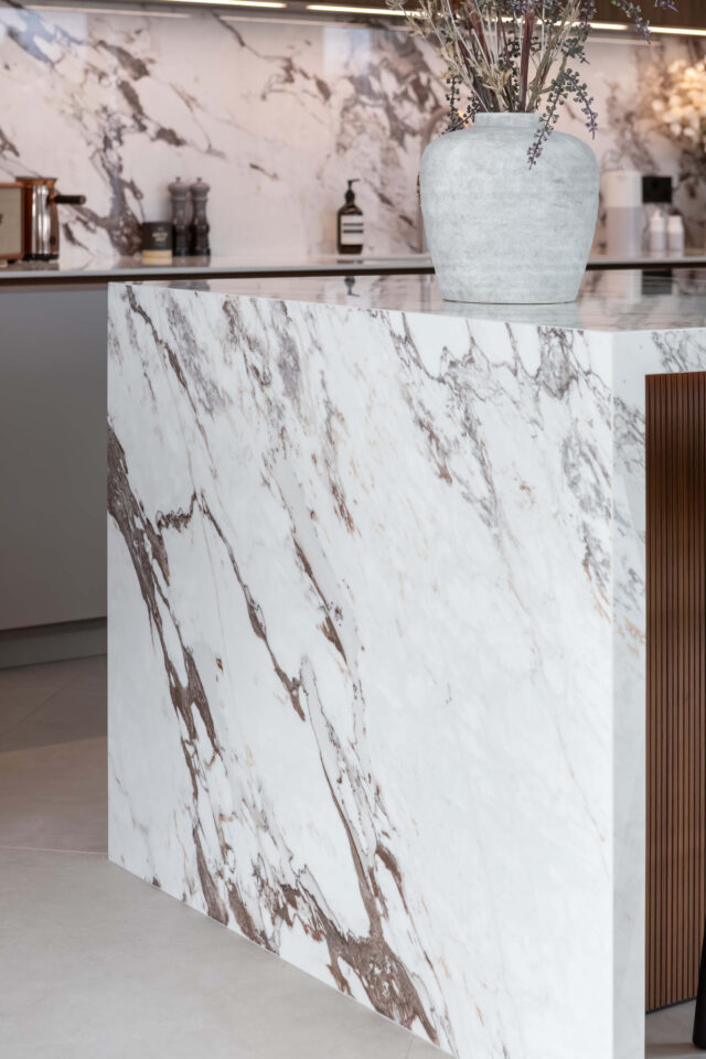 The worktops are 12mm Marazzi porcelain, vein-matched for seamless continuity across the kitchen and splashback. Their durability and refined finish make them ideal for a high-use, high-performance space.