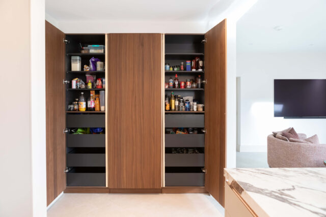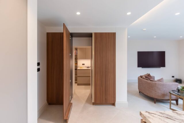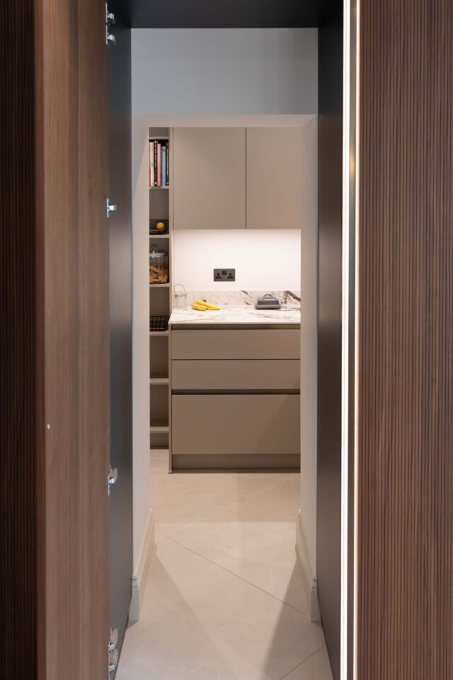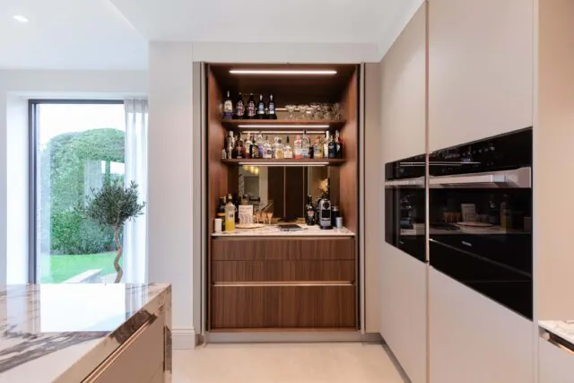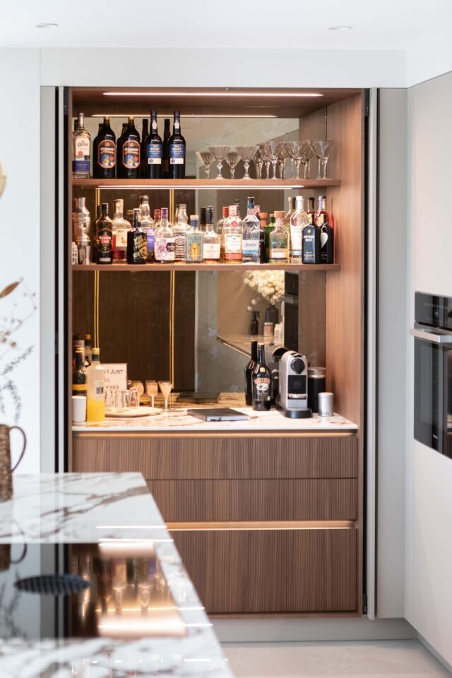 Feature elements include a bespoke pocket door bar unit and a hidden pantry, both designed to maintain clean lines while offering practical, concealed storage. An antique bronze mirrored wall adds depth, reflection and a subtle touch of glamour to the space.