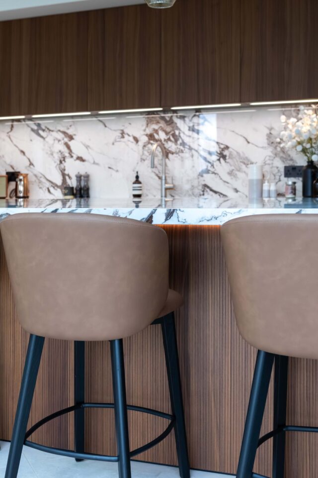 Lighting plays a key role throughout the design, with iLuminate’s mood-enhancing features used to create atmosphere and highlight the beautiful materials. The generous 4.5m island forms the centrepiece of the open-plan layout, providing ample space for food preparation, casual dining and social gathering.