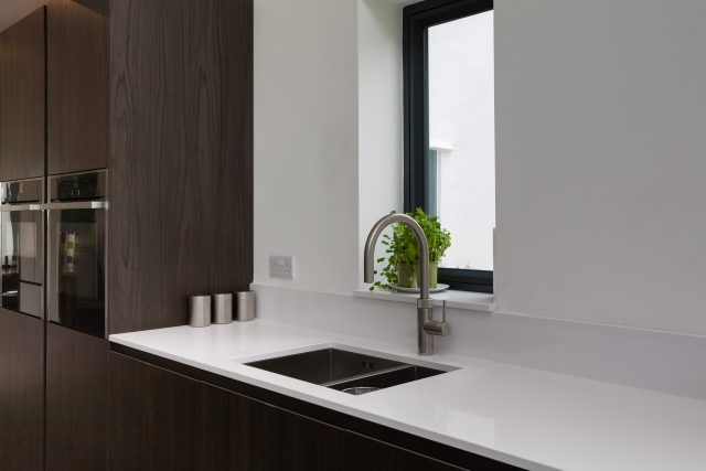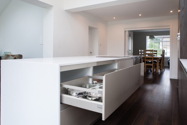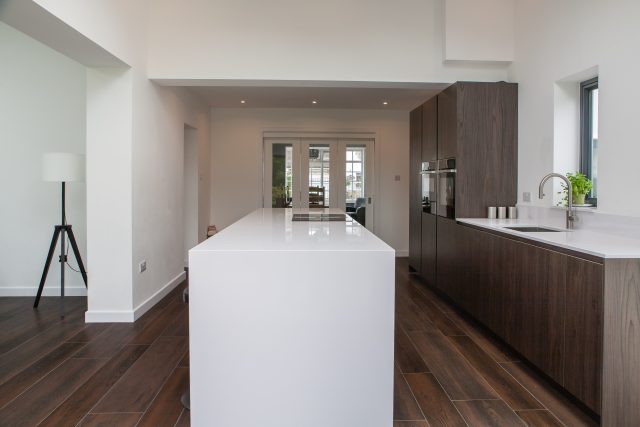Dark flooring pairs beautifully with the similarly dark Sherwood cabinets, establishing a bold design statement. Skylights and bi-fold doors provide ample natural light which reflects off the stunning Blanco Zeus Quartz worktop and Brilliant Cubanit units, emphasising the wood grain detailing. The generous use of white in this kitchen creates a dramatic contrast whilst producing a bright and spacious atmosphere.