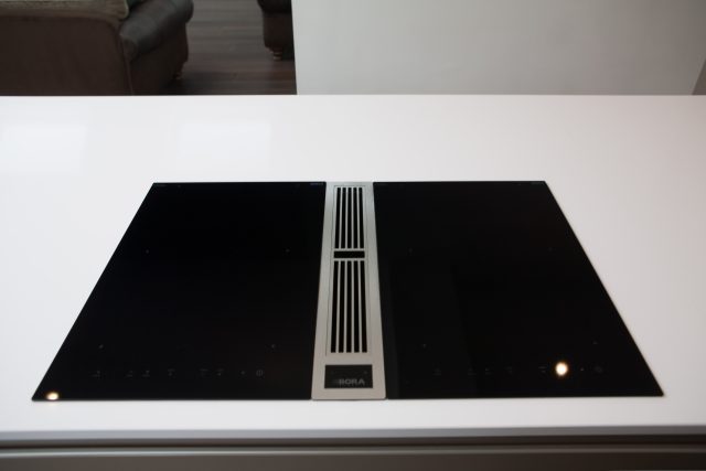 Cutting-edge appliances including a Bora hob, Quooker hot tap and pair of AEG ovens give this kitchen impressive functionality. The large kitchen island and multiple tower units offer abundant storage, keeping this minimal design flawlessly uncluttered for maximum impact. The island allows plenty of space for guests to sit and socialise with the host whilst they’re cooking at the cleverly positioned hob. The handy safety features and internal extraction make the Bora hob ideal for a kitchen island. Contemporary black leather bar stools tuck neatly below the ledge of the island for an uncluttered and sleek seating area that doesn’t obstruct the walkway. This kitchen is designed with practicality in mind as well as striking aesthetics.