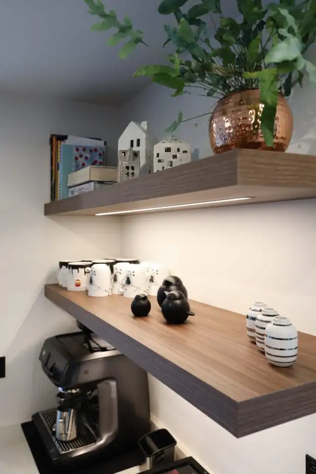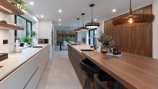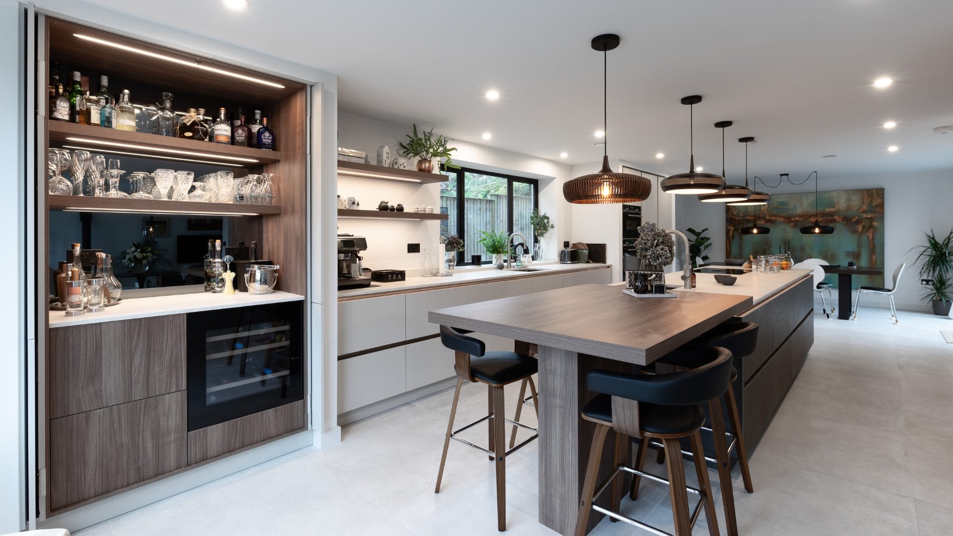 Liebherr refrigeration is thoughtfully integrated into the design, maintaining the kitchen’s clean and modern look. The natural wood tones and carefully placed warm lighting enhance the welcoming ambiance, creating an inviting and cosy environment for everyday use.