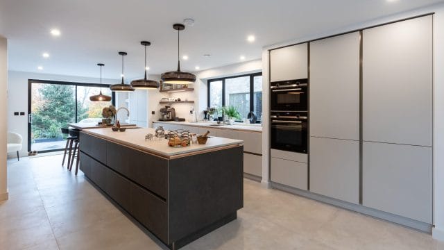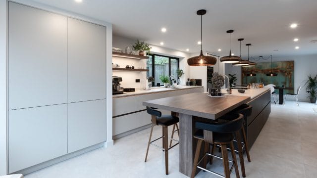 This modern kitchen showcases a stunning blend of materials and textures, combining Pronorm’s XLine cabinetry in Pebble Grey, Artstone and Urban Walnut finishes. The space is designed to exude a sense of sophistication and functionality, perfectly suited for contemporary living. The combination of open shelving and integrated storage solutions ensures the kitchen is as practical as it is stylish, allowing for easy organisation while maintaining its sleek aesthetic.
