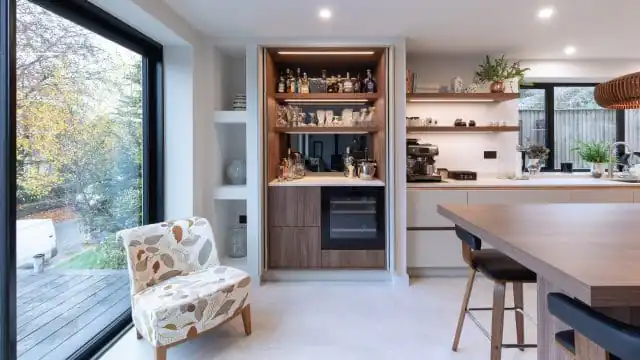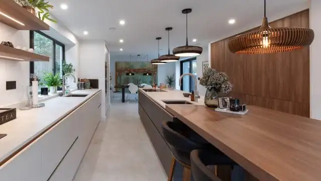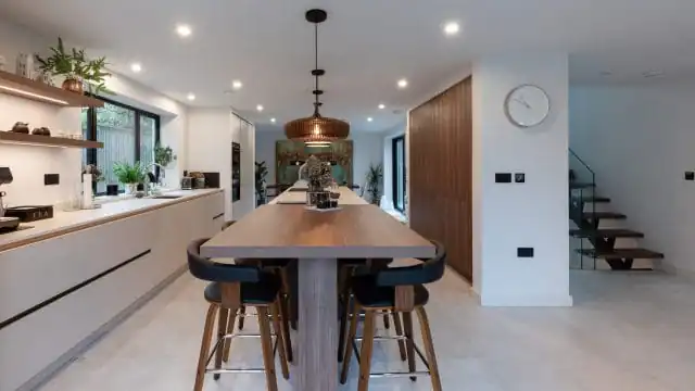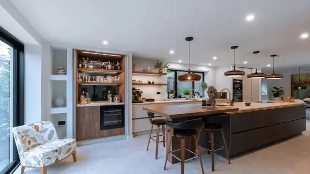 The layout is anchored by a spacious island with stylish bar seating, fostering social interaction and making it the true heart of the home. With its harmonious combination of modernity, practicality and luxury, this kitchen stands out as a beautifully crafted and highly functional space.