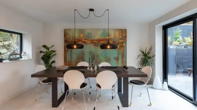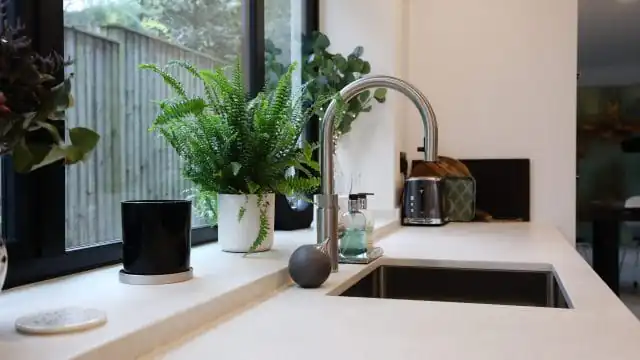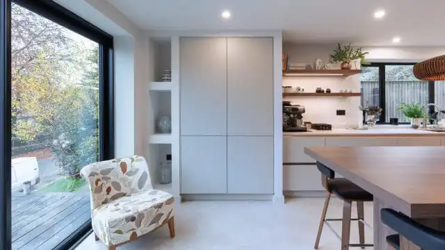 The kitchen’s centrepiece is its Concrete White Quartz worktops, which add a touch of elegance and durability to the design. Complementing this are premium appliances, including Siemens ovens, a Bora hob for precision cooking and a Quooker tap, offering instant boiling water for added convenience. These state-of-the-art features working together ensures that the kitchen is both highly functional and visually appealing.