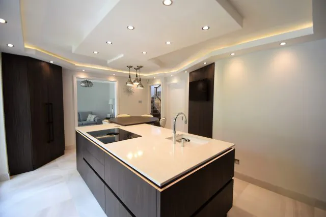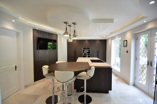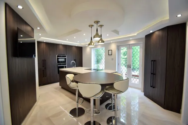 The distinctive design of the kitchen island is emulated in the unique multi-level coffered ceiling to emphasise the cutting-edge bespoke forms. The ceiling features gorgeous remote-controlled ambient lighting along the bulkhead, paired with stylish downlights to create the perfect atmosphere for entertaining whilst giving enough light for a bright and welcoming environment during the day. The carefully positioned downlights highlight the stunning dark wood tower units and pantry for a glamourous finishing touch. A trio of pendant lights reflect the teardrop shape of the table and ceiling plinth, unifying the design whilst beautifully illuminating the breakfast bar below.