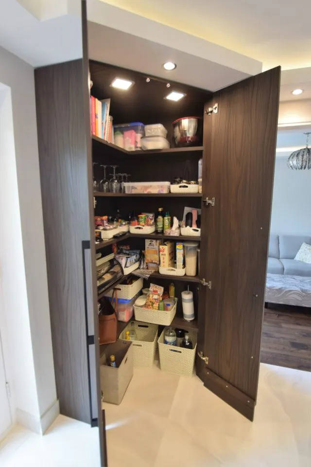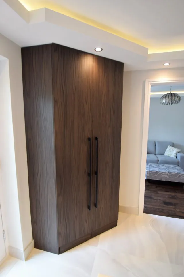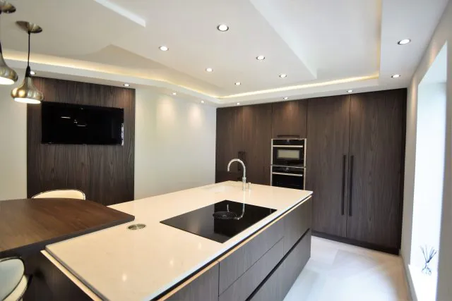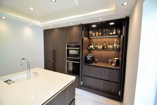 Our clients had strong ideas about the look of their design, opting for stunning Dark Sherwood units with sleek black handles and luxurious Snowy Ibiza Quartz worktops, creating an opulent yet contemporary style. We introduced the Dark Sherwood panelling onto the wall to balance the design whilst cleverly disguising the wall-mounted television screen. This fantastic kitchen also conceals some outstanding features such as a gin bar hidden behind pocket doors and a spacious walk-in corner larder. This remarkable kitchen design maximises functionality in a compact space as well as looking truly exceptional.