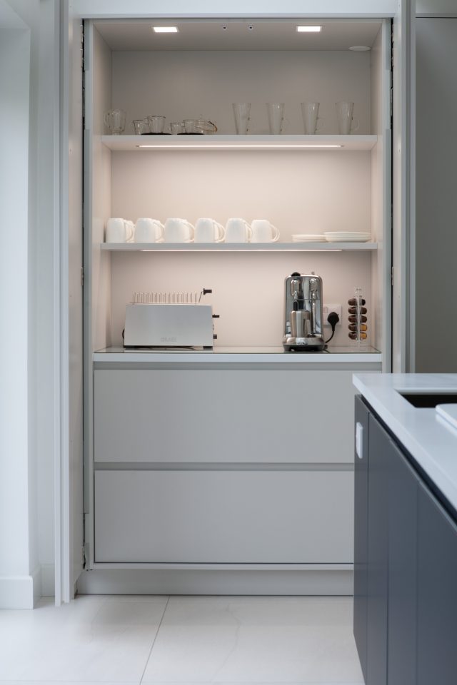 Concealing small appliances within a handy breakfast station keeps the worktops clutter-free allowing the clean lines and stunning minimal design of this Ilkley kitchen to truly shine. The breakfast station is easily accessible from the island seating area, which means guests or family members can feel comfortable helping themselves to tea or coffee while our Ilkley client prepares food. This extraordinary modern kitchen embraces our Ilkley client’s home, providing a spectacular space for every occasion from everyday mealtimes to extravagant celebrations.