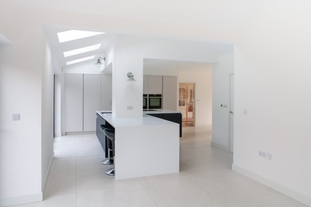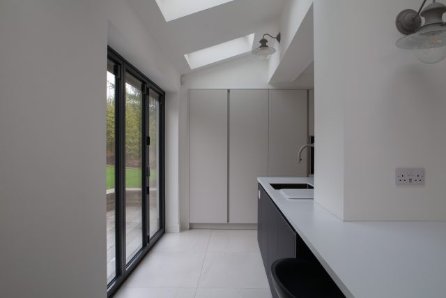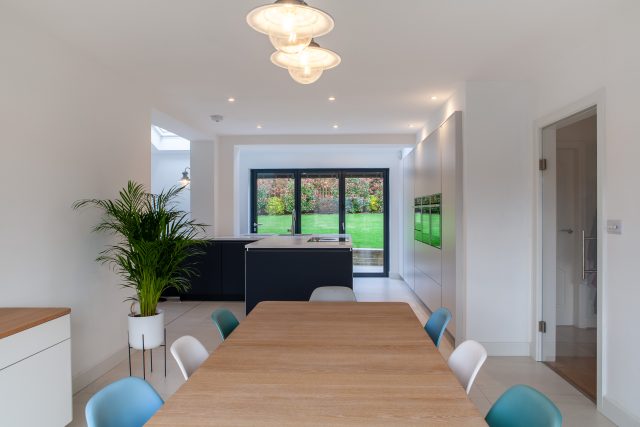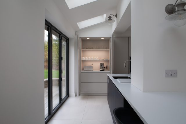 "At the top of the brief was a large island that could cater for the client’s passion for cooking and the ability to move to different spaces for preparation. Though the island incorporated the majority of the worktop space, we created further space for preparation/mixing within the old chimney breast and a further worktop within a pocket door system where tea and coffee could be made but also shut off when not required. Our challenge was to extend the kitchen island into the new living space giving a sense of cohesion without feeling like the kitchen was dominating the space. This was achieved by extending a built-in dining table off the kitchen island which wrapped around to a ‘dresser’ area on the other side of the island."