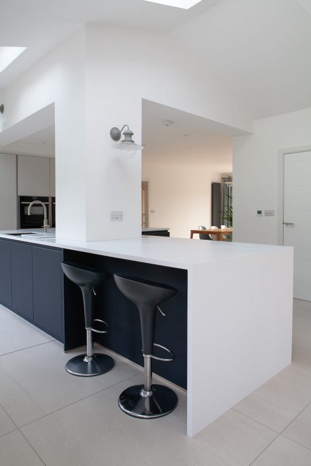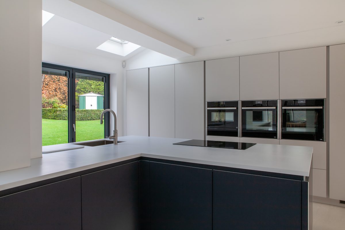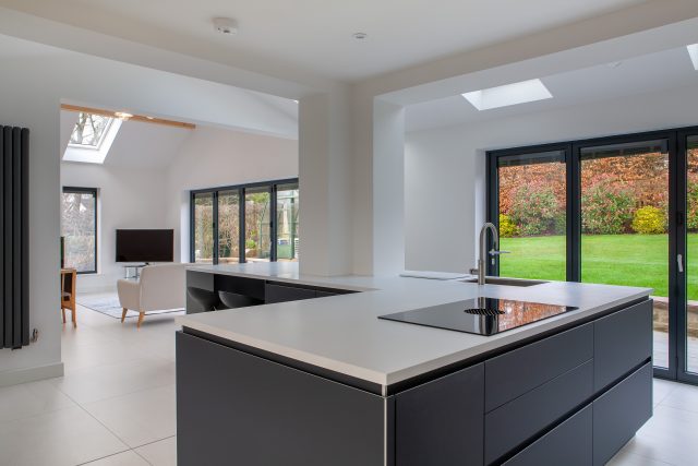 One of the greatest successes of this exceptional contemporary Ilkley kitchen is the way in which our talented designers have incorporated the structural pillar within the L-shaped island. The distinctive architectural form of the island mirrors the L-shaped floor plan, whilst including the pillar in the island’s role of establishing communication between the dining and living areas.
