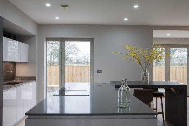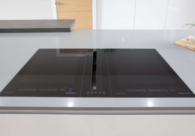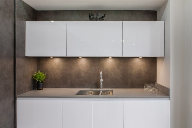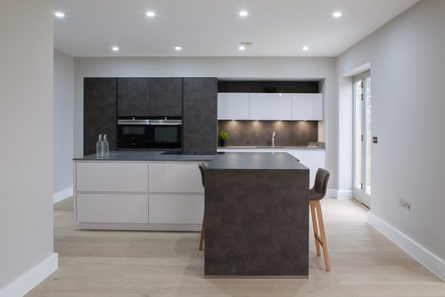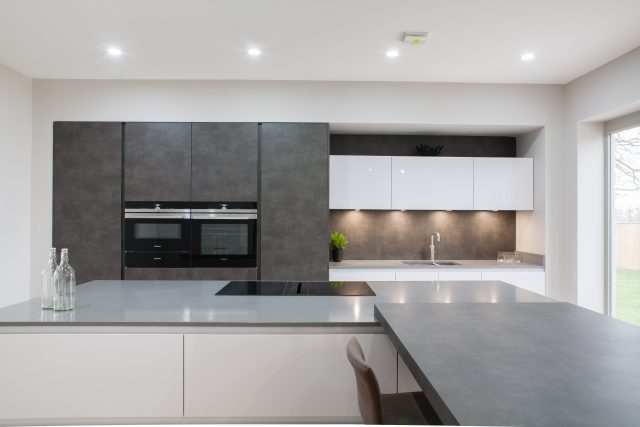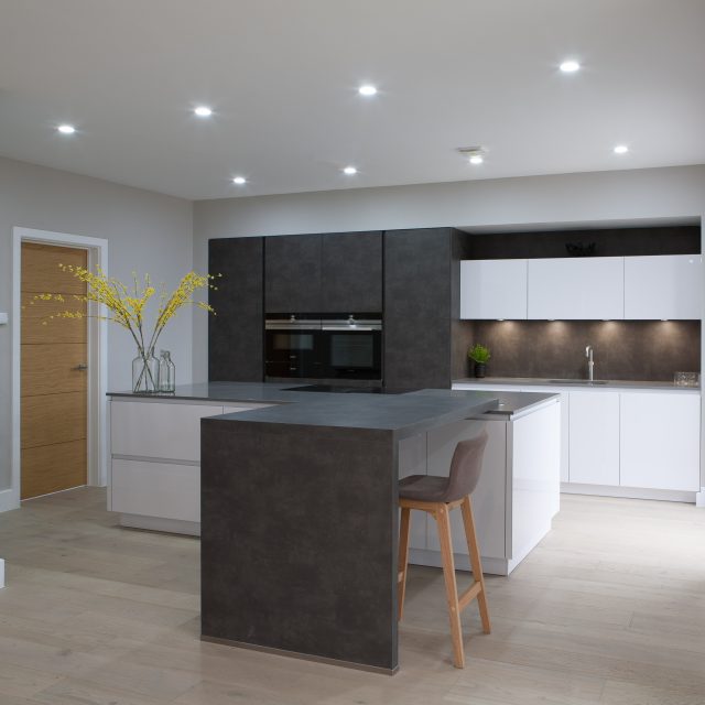 The symmetry of this design creates a striking effect that’s exceptionally pleasing on the eye. The state-of-the-art Siemens ovens either side of the sink area bring a beautiful balance that’s emphasised by the recessed overhead cabinetry in dark cement finish. This design feature is highlighted by stylish under-cabinet lighting which gives the cupboards the appearance of hovering above the space.