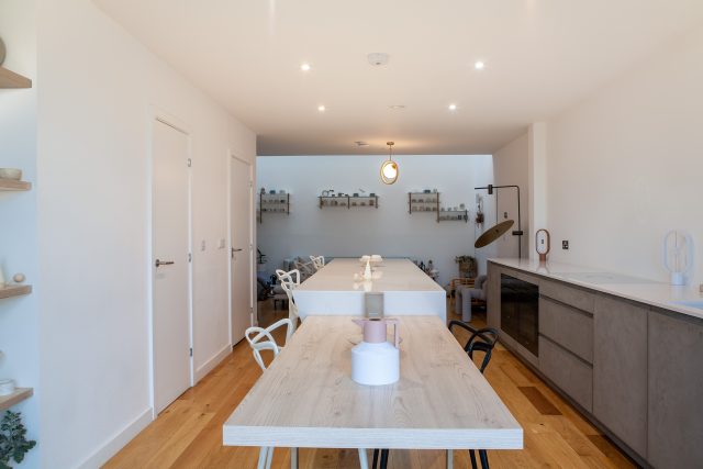 In this breath-taking design-led Leeds kitchen, less is undeniably more. A seamless run of concrete effect base units running parallel to a pristine white dining island create a simple yet sublime layout, making full use of the narrow room while establishing a spacious open feel. Handleless Miele appliances and a flush-fitting white Elica downdraft hob seamlessly blend with their surroundings, continuing the clean, unobtrusive aesthetic.