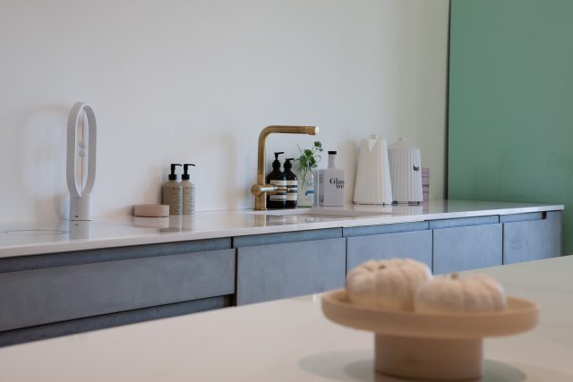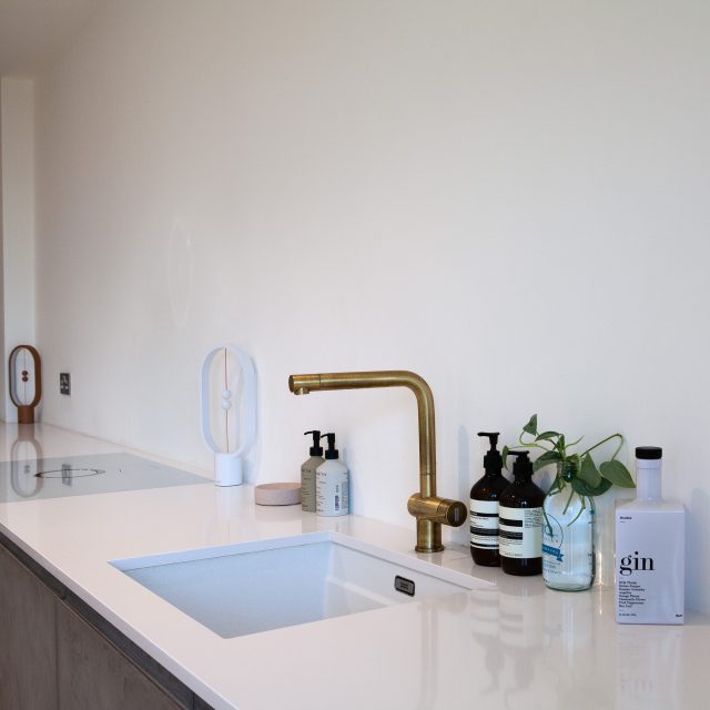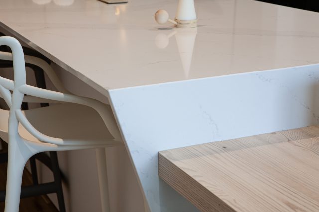 With such a minimal design, precision and attention to detail are everything. Thanks to Warendorf’s state-of-the-art manufacturing technology and unrivalled German precision engineering, we were able to achieve a truly immaculate cabinet finish. The curved ends of Warendorf’s superb handleless rail system create a subtle yet sophisticated design detail. Flawlessly cut, bespoke worktops from Silestone complete this pristine interior. The waterfall ends and dramatic angled breakfast bar adds a striking flourish.