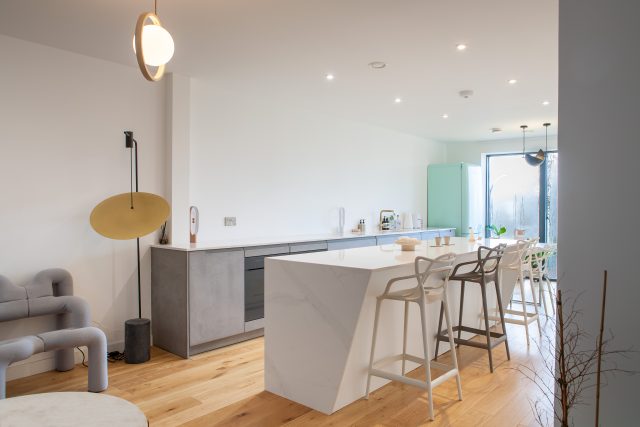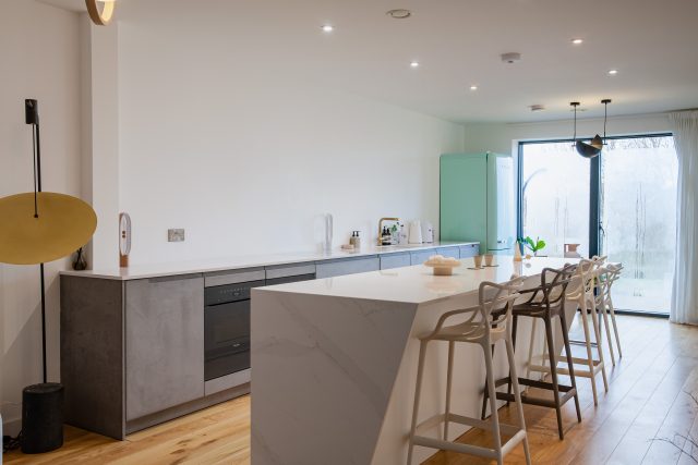 Despite its clean contemporary looks, this Leeds kitchen certainly doesn’t lack character or functional capabilities. A vibrant Smeg fridge adds a quirky pop of colour, while stylish Kartell Masters bar stools offer an iconic touch. Several unique lighting pieces further elevate the space.