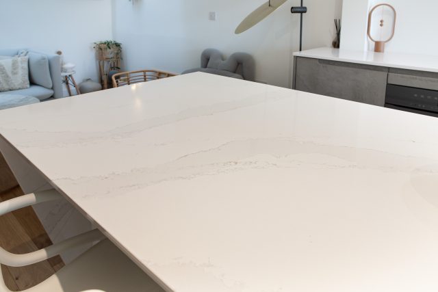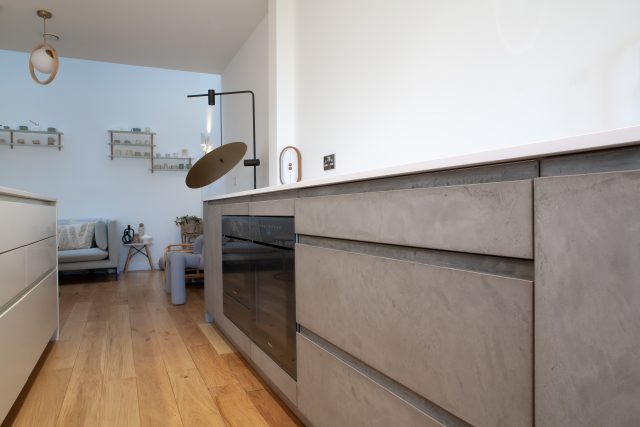 WARENDORF REAL CONCRETE & MATT WHITE HANDLELESS KITCHEN WITH SILESTONE ETERNAL CALACATTA GOLD WORKTOPS