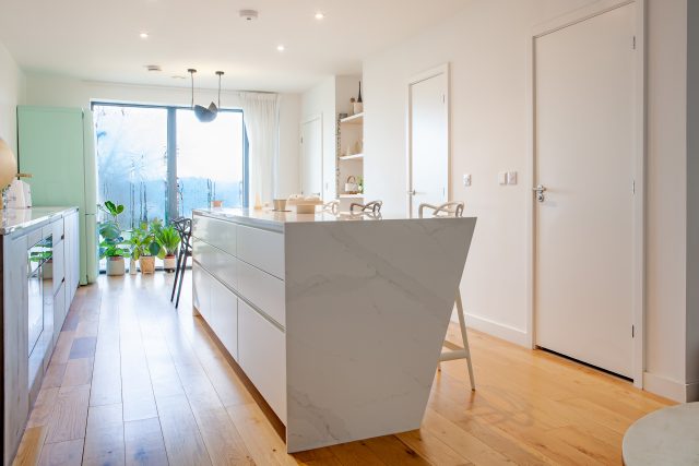 "The real concrete doors are truly stunning. Pairing them with the matt white island and Calacatta worktops with mitred waterfall ends makes this super minimalistic kitchen a real showstopper."