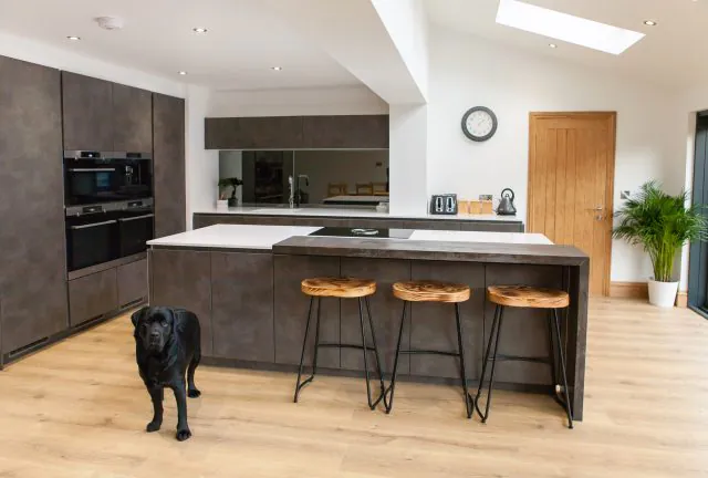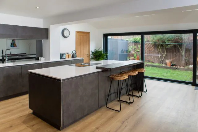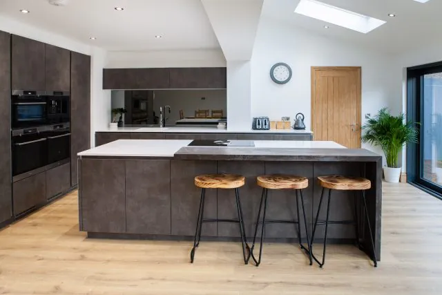 This breathtaking monochrome kitchen in Wakefield feels fresh and airy with a sleek industrial loft vibe. The skylights and extra-wide glass doors give plenty of natural light to this space, emphasising the gorgeous cement texture on the units and brightening the white storm quartz worktops for a striking contrast. Light oak finishes and wooden bar stools create a laidback atmosphere, ideal for casual dining at the breakfast bar.