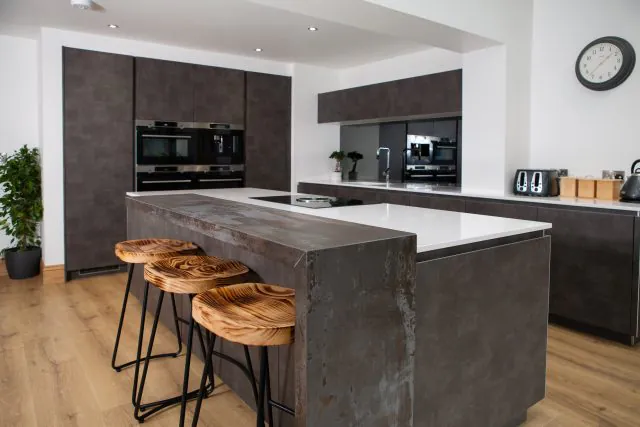 DARK CEMENT HANDLELESS KITCHEN WITH TRILIUM DEKTON BREAKFAST BAR
