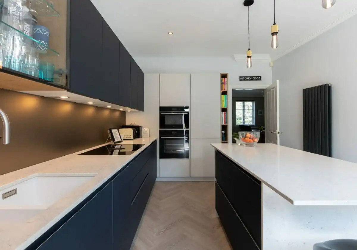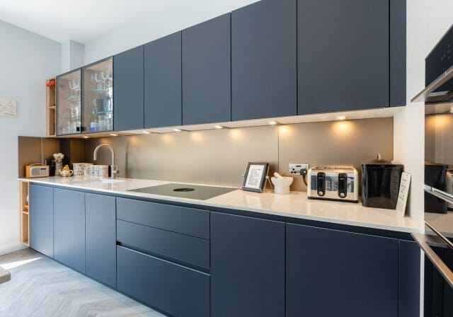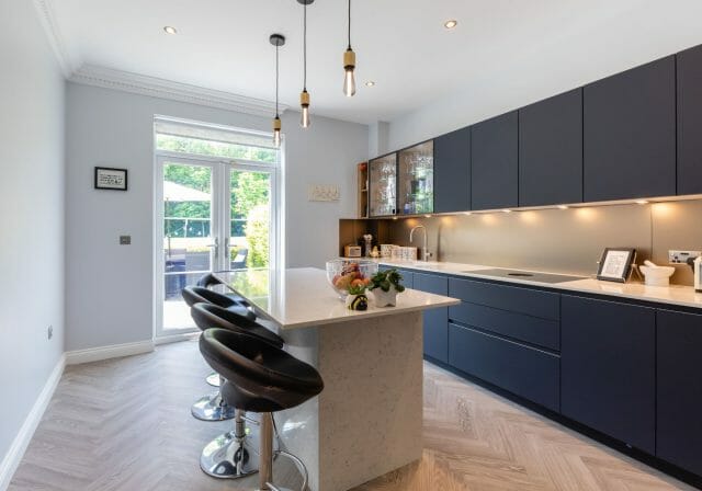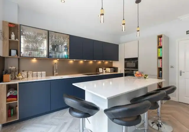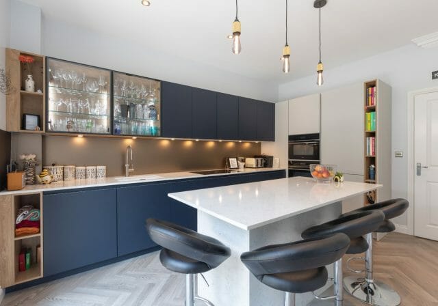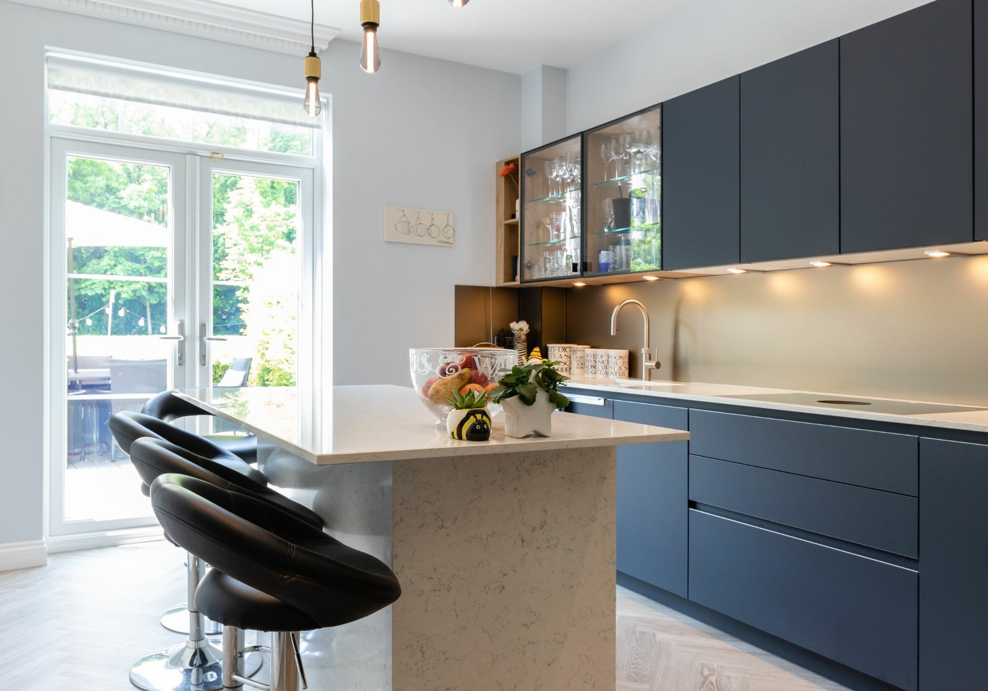 This stunning York kitchen strikes the perfect balance between sleek and minimal styling and elegant, homely touches. A clean and seamless L-shaped layout combines with striking handleless cabinetry to make a bold design statement. The gorgeous Midnight Blue and soft White surface finishes bring a stylish and sophisticated feel to the scheme. Enveloped in luxurious Silestone White Arabesque quartz, the island establishes a dramatic architectural focal point. However, the Oak End Grain detailing and brushed bronze splashback radically alter this stark contemporary aesthetic. They offset the clean-lined cabinetry beautifully, bringing an inviting warmth and softness to the interior.