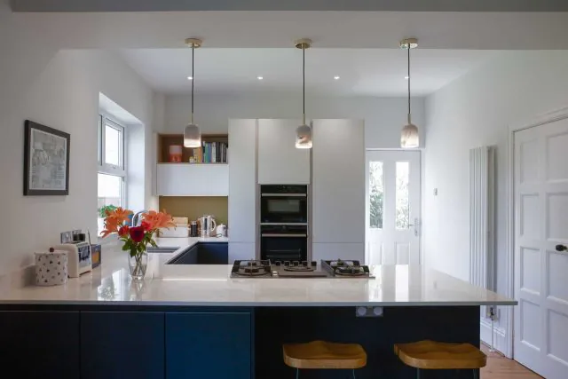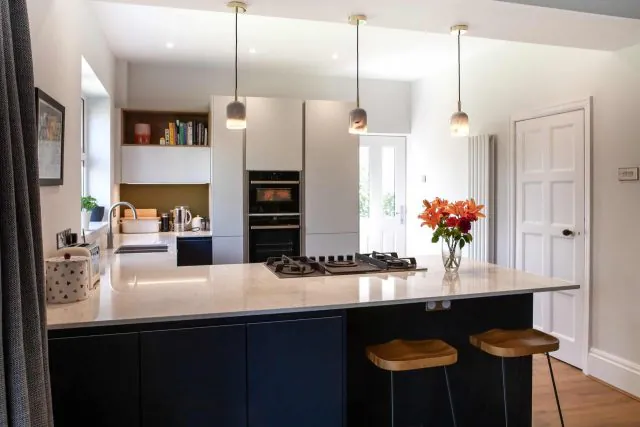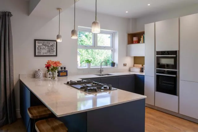 As well as impacting the functional layout of the room in terms of cooking, the peninsula similarly elevates the stylish dining area. Including breakfast bar seating, the peninsula breaks up the kitchen and dining areas, establishing a sense of cohesion whilst also distinguishing the two separate zones.