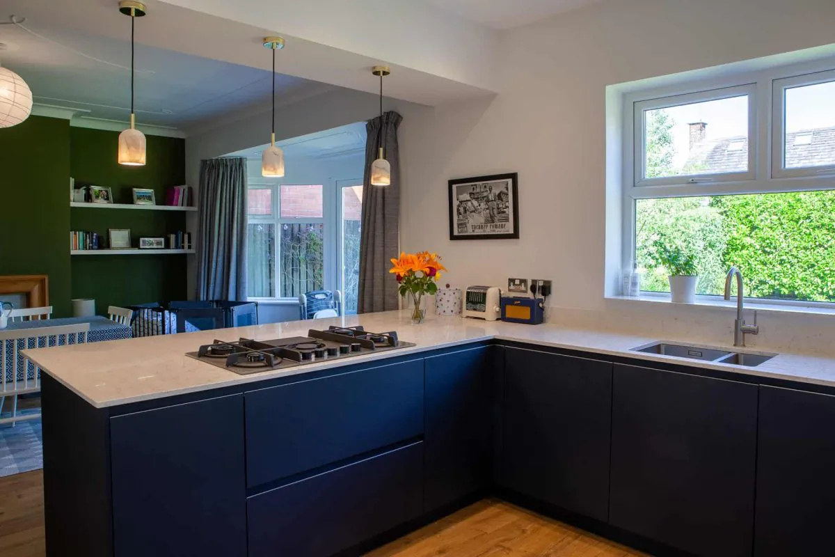 Our client’s Leeds kitchen has been completely transformed. Removing the internal wall allowed us to open up the room, creating a more spacious kitchen with a bright and characterful dining area. Our clients were delighted with how we retained a homely atmosphere whilst also making the space feel airy and clean.
