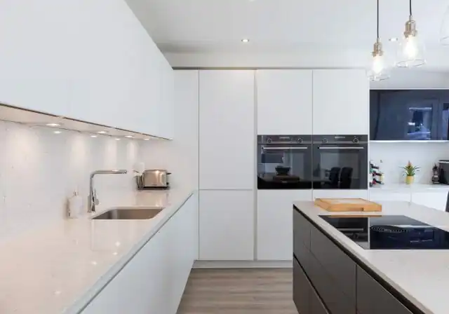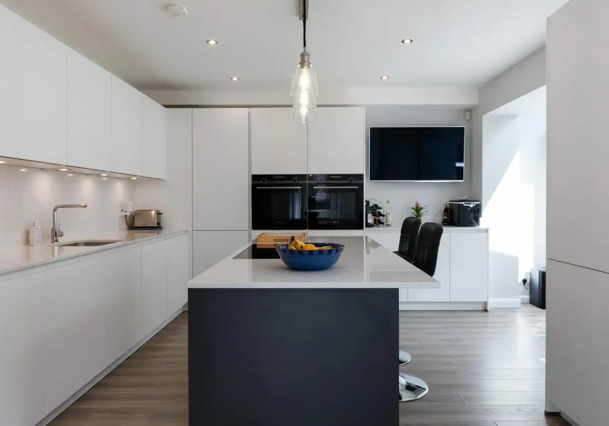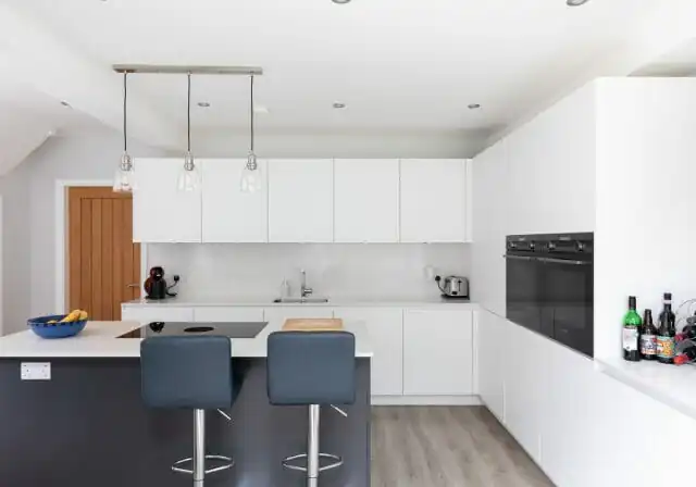 PRONORM Y-LINE ARCTIC WHITE & MIDNIGHT BLUE KITCHEN WITH SILESTONE WHITE ARABESQUE WORKTOPS