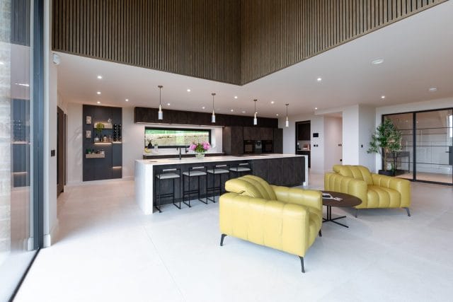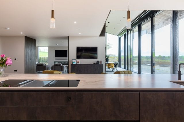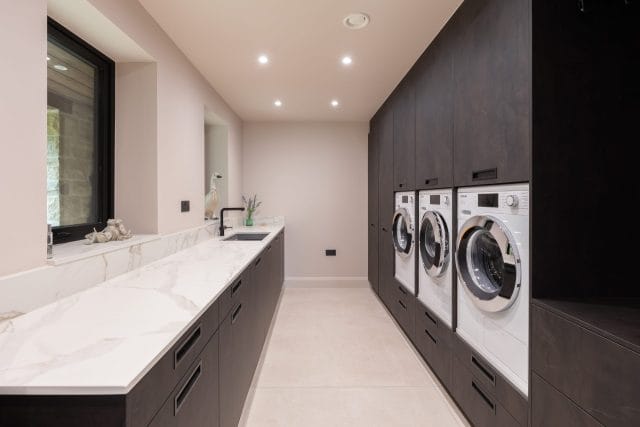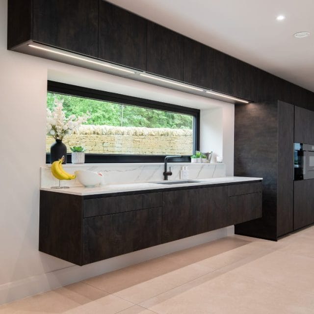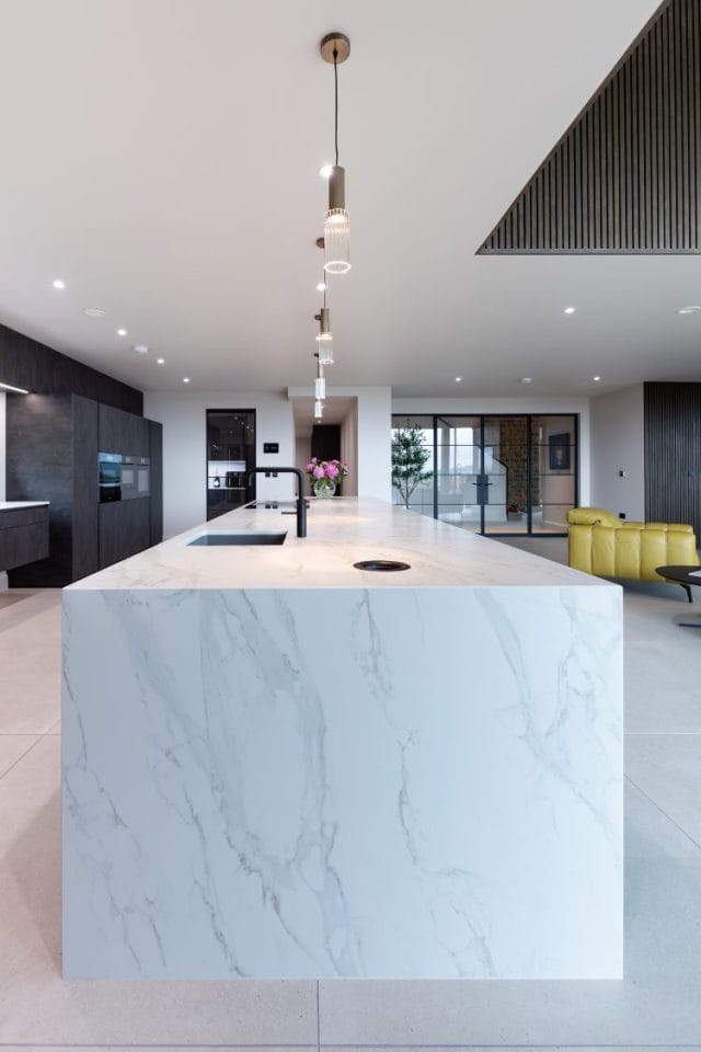 This kitchen features Dekton Morpheus porcelain worktops which look stunning and provide a durable, easy-to-clean surface, perfect for any kitchen activity. The cabinetry features a dark, textured finish that adds depth and richness to the space, and soft-close mechanisms ensure a smooth and silent operation. Combining darker tones with lighter elements creates a balanced and inviting atmosphere in the home. The dark cabinetry contrasts beautifully with the white worktops, while the soft, neutral floor tiles ground the space and add to the overall elegance.