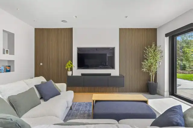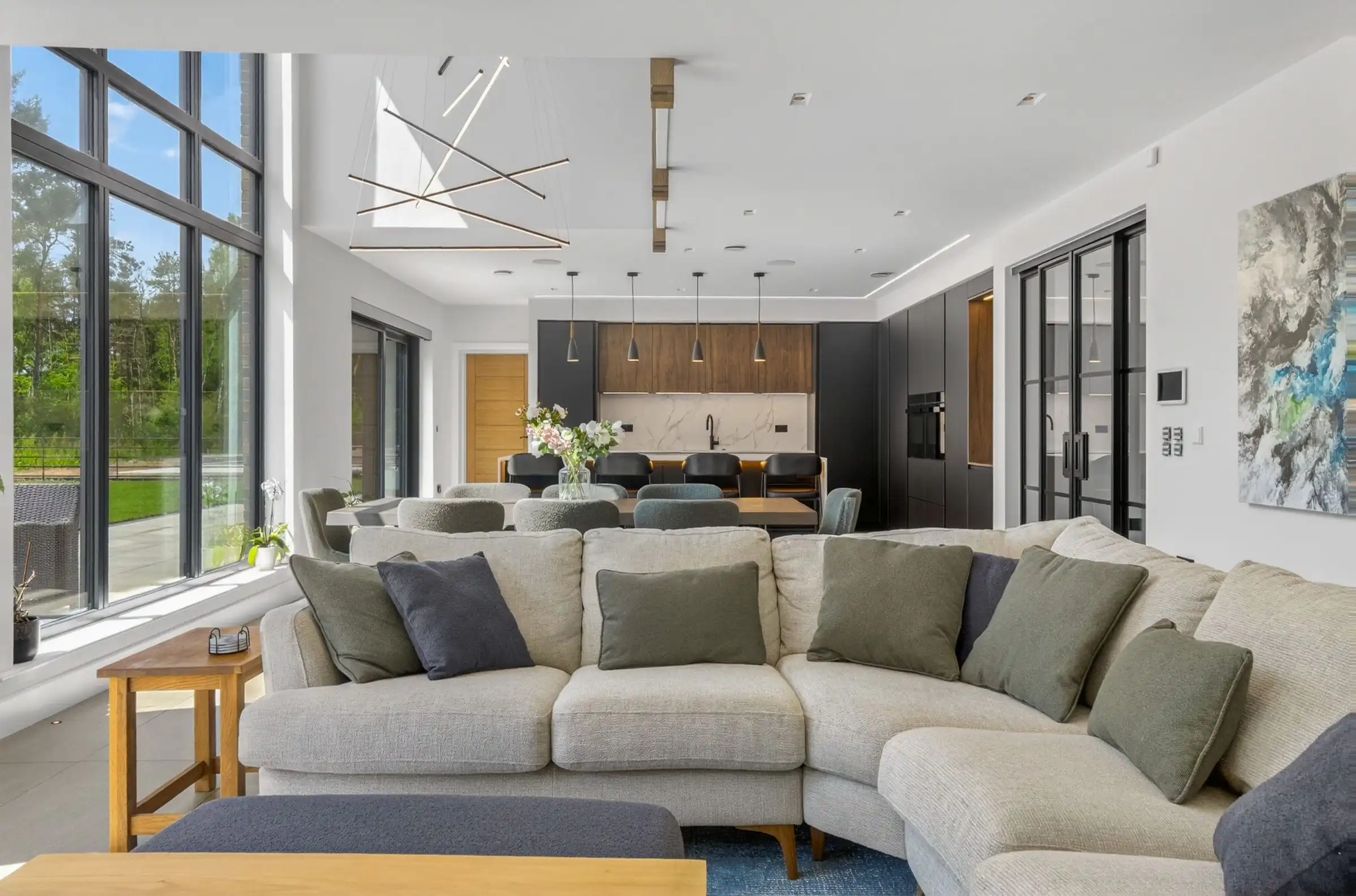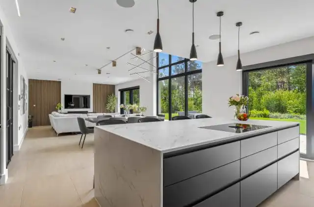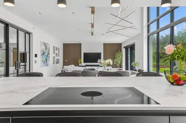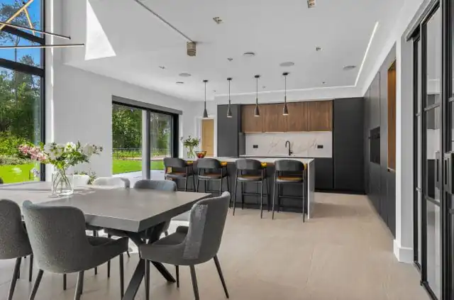 The open-plan layout creates a seamless connection between the kitchen, dining area and living space, making it ideal for both relaxed family time and entertaining guests. This thoughtful design encourages a natural flow throughout the home, allowing for easy interaction while cooking, dining or unwinding. The kitchen becomes a central hub, combining style and practicality within a spacious, sociable setting.