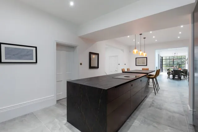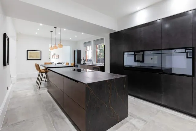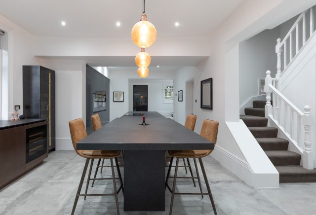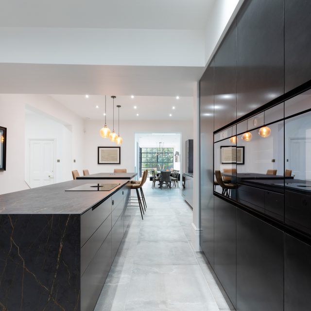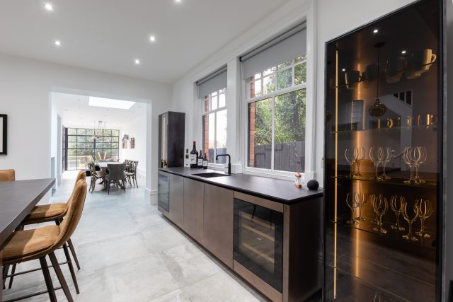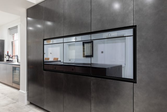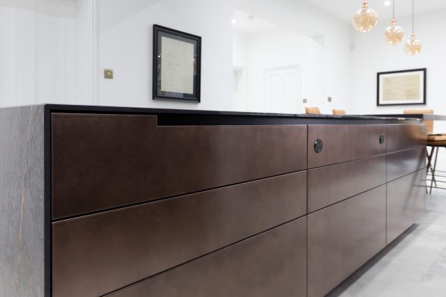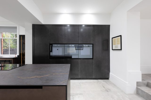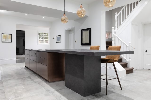 Comprising a flawless bank of built-in Carbon Steel units and a showstopping Copper island with dramatic Dekton Laurent worktops, this spectacular Wakefield kitchen makes a striking first impression. Crafted using a combination of precision engineering and traditional craftsmanship, Warendorf’s immaculate cabinetry commands the room, setting a sophisticated atmosphere. Bora’s minimalist venting hob and Quooker’s sleek boiling water tap keep the surfaces clutter-free, adding to the impact.