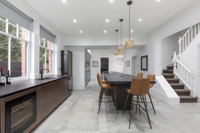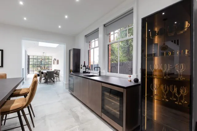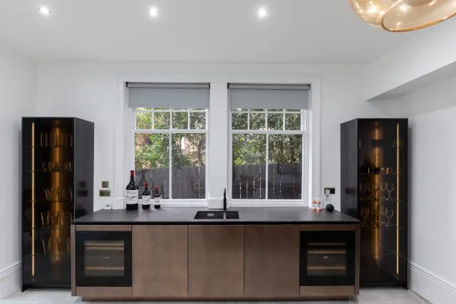 However, this extraordinary kitchen doesn’t just look spectacular. The spacious island provides ample storage and countertop space. Plus, with the innovative V-ZUG ovens and fridge at one end and the Quooker tap and wine chillers at the other, our clients are able to prepare meals with seamless efficiency, delighting friends and family. Situated next to two stunning illuminated glass display cabinets and a pair of luxurious wine chillers, the breathtaking breakfast bar provides the ideal spot to relax with a glass of wine. Our cleverly conceived layout makes this chic Wakefield kitchen perfect for cooking and socialising.