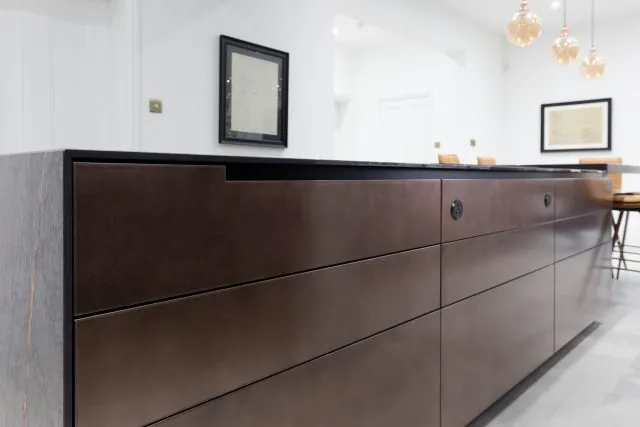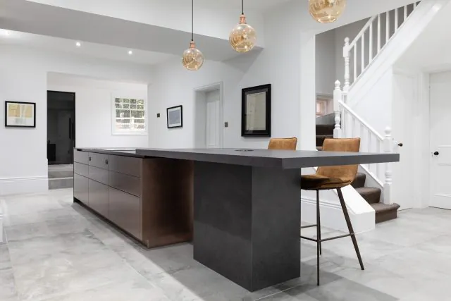 Featuring a single architectural supporting leg, the breakfast bar makes a stunning design feature. The Dekton Eter cladding pairs beautifully with the Carbon Steel doors, offsetting the Copper island brilliantly. A trio of stylish pendant lights accentuate the bar area. They work harmoniously with Warendorf’s gorgeous glowing display cabinets to create a sumptuous ambience, seamlessly differentiating the cooking and relaxing areas. Our dramatic design has undeniably taken our client’s Wakefield kitchen to the next level.